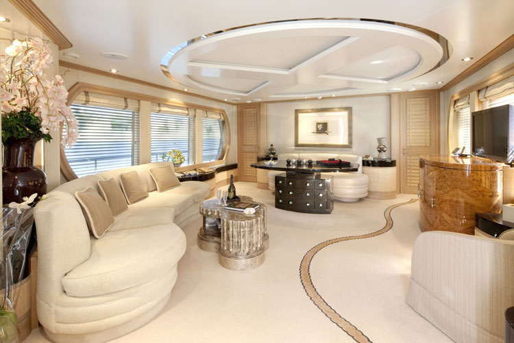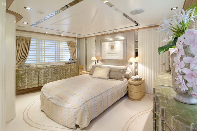 Designed by Terence Disdale, the motor yacht La Mascarade (ex La Masquerade) features an eclectic mix of surfaces, materials and textures, including silver leaf, apricot silk, gloss lacquer, soft shades of fawn and taupe, light oak and pale wood carpets. The elegant asymmetric saloon has a separate dining area, both with large windows and whitewashed oak to create a pleasant and light interior.