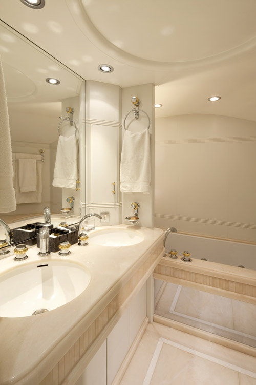 Accommodation aboard 30m Feadship motor yacht La Mascarade is provided to 8 charter guests in 4 lovely cabins. The master suite is situated on the main deck featuring a queen bed, en-suite facilities with a spa pool bath, shower and double basins. The full width VIP suite can be found on the lower deck with en-suite facilities, including a bath and a double basin. There are two double cabins located on the lower deck with en-suite bathrooms featuring separate showers.