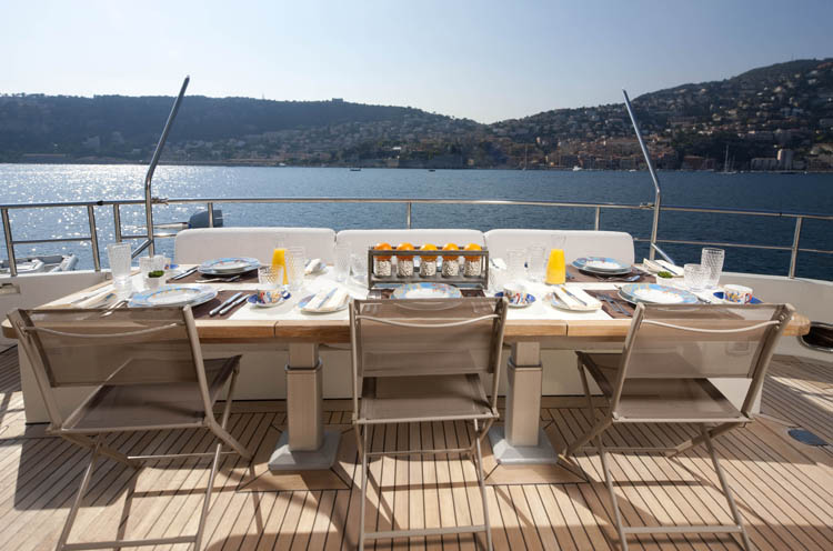 There is also a good exterior space aboard La Mascarade yacht, with the fly bridge and sundeck providing seating to 12 guests at two aft dining tables for those pleasurable al-fresco dining experiences during the lovely warm Mediterranean summer evenings.