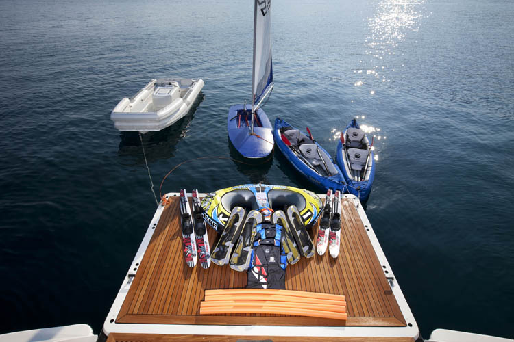 As for her audio/visual equipment and deck facilities, La Mascarade charter yacht offers WiFi Internet, TV, DVD and CD library. Her water toys and equipment include a 4.5 metre tender, 2 Sevylor 2 man inflatable kayaks, 2 sets of fins and masks, water-skis (adult and children), 4 noodles, 2 towable donuts, 2 sea-blades, 2 aqua-glides and fishing gear.
