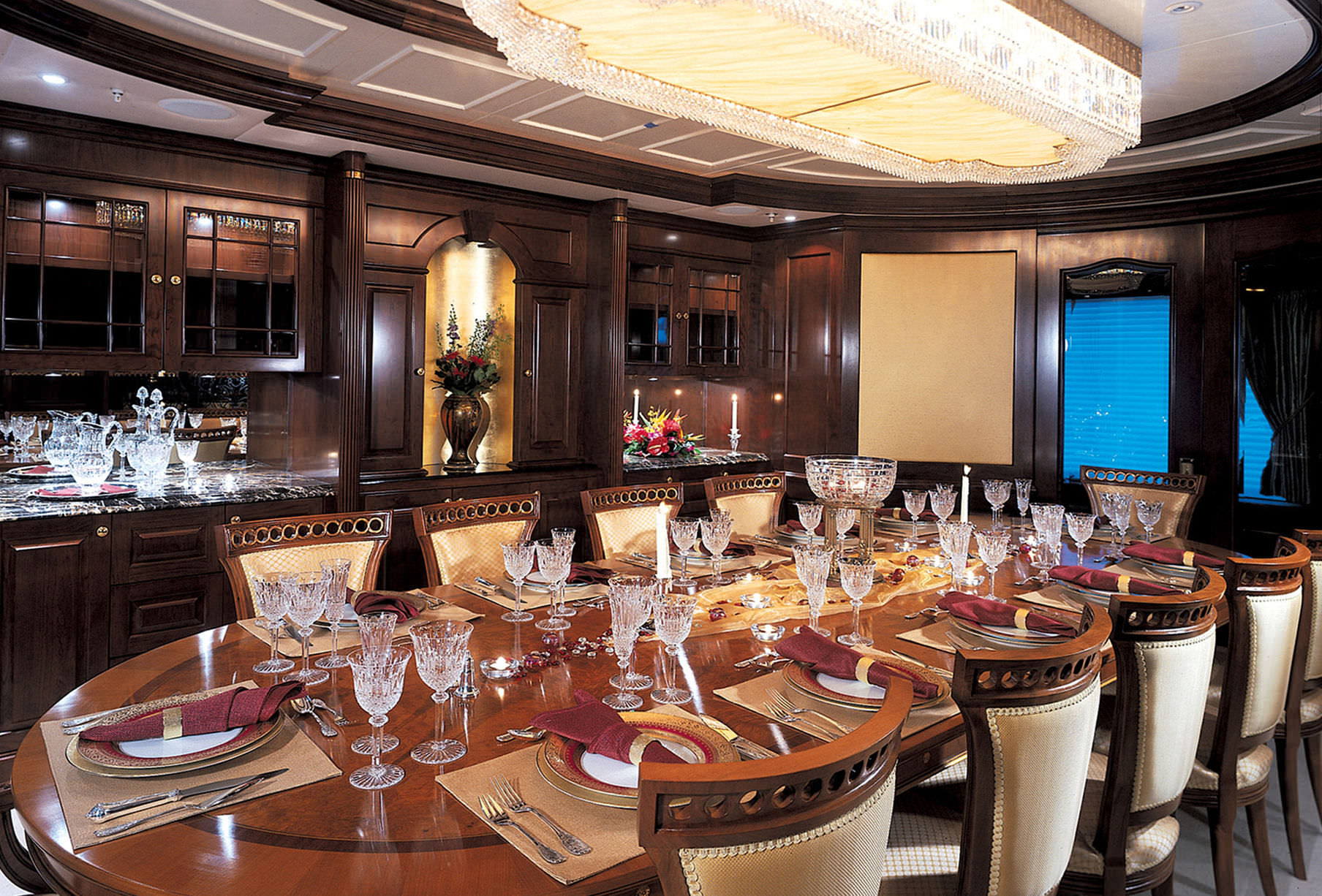From the formal dining area to the stairwell, superyacht MUSTIQUE is covered in intricate details that create a fantastic atmosphere for lavish family charters and special events. The main salon is a rich environment in dark wood ready to receive visitors and entertain them with live music from the grand piano. The seating places the focus firmly on the guests for intimate conversation before or after a sumptuous meal in the dedicated formal dining area that seats up to 12 guests.