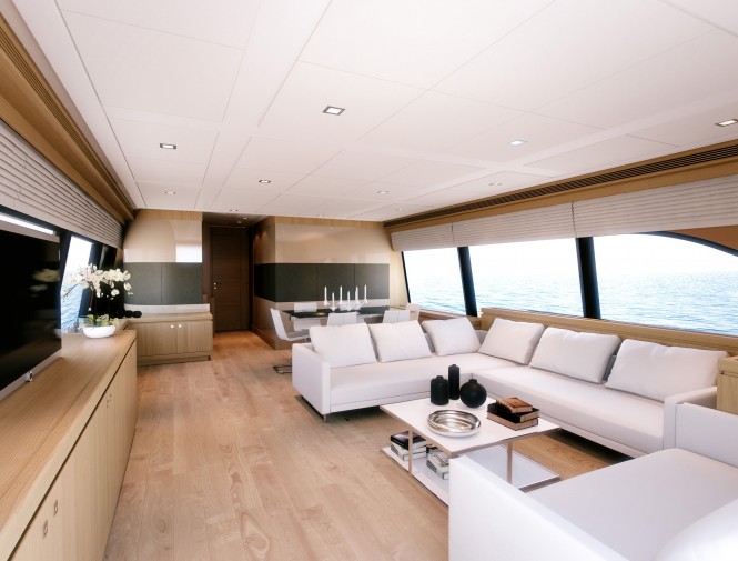 The large cockpit is furnished with a fixed teak table which can be extended to seat eight, and provides access to the salon, split into the living and dining areas. The windows, larger than those fitted on the previous model, let natural light filter through. Exclusive materials are skilfully used to move the volumes, making space more dynamic. On board the yacht on display at the Cannes boat show the elm wood used for the furnishings in the various different environments, alternates with the bleached oak of the flooring and the lacquered and leather wall panelling produced in the colours dove grey and sand.