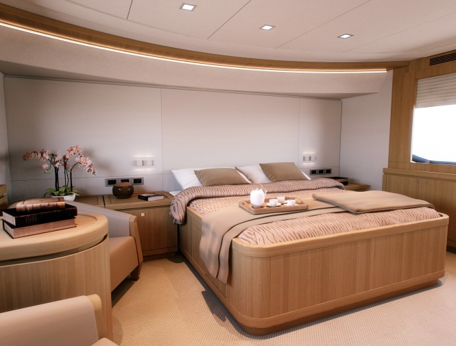 The master suite is located in a privileged position at bow on the main deck, in order to ensure complete privacy. Light dominates this area, too, filtering in through the large windows, and lighting the interiors, revealing prestigious materials in natural shades. Sand-coloured lacquered panelling alternates with leather details, the material in which a panel has been produced to house the plasma TV located in the wall opposite the bed.