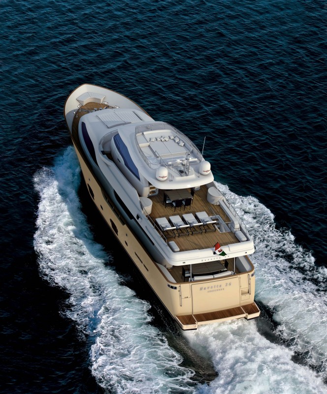 Maxi Yacht Navetta 26 Crescendo is the very first model in the revamped semi-displacement line, specially designed for those owners who prefer “slow motion” as it were, a leisurely cruise in complete silence and comfort.