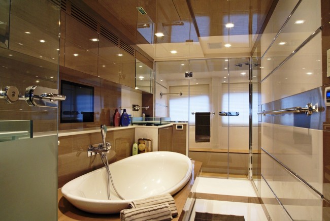 Indoors Yacht NOOR’s décor is characterized by the elegance of polished greige tinted oak veneer throught out the entire yacht except for the main saloon and it is fitted in a way to create no contrast but a warm and extremely elegant ambience, due also to a wise use of Thassos marble and precious carpets.