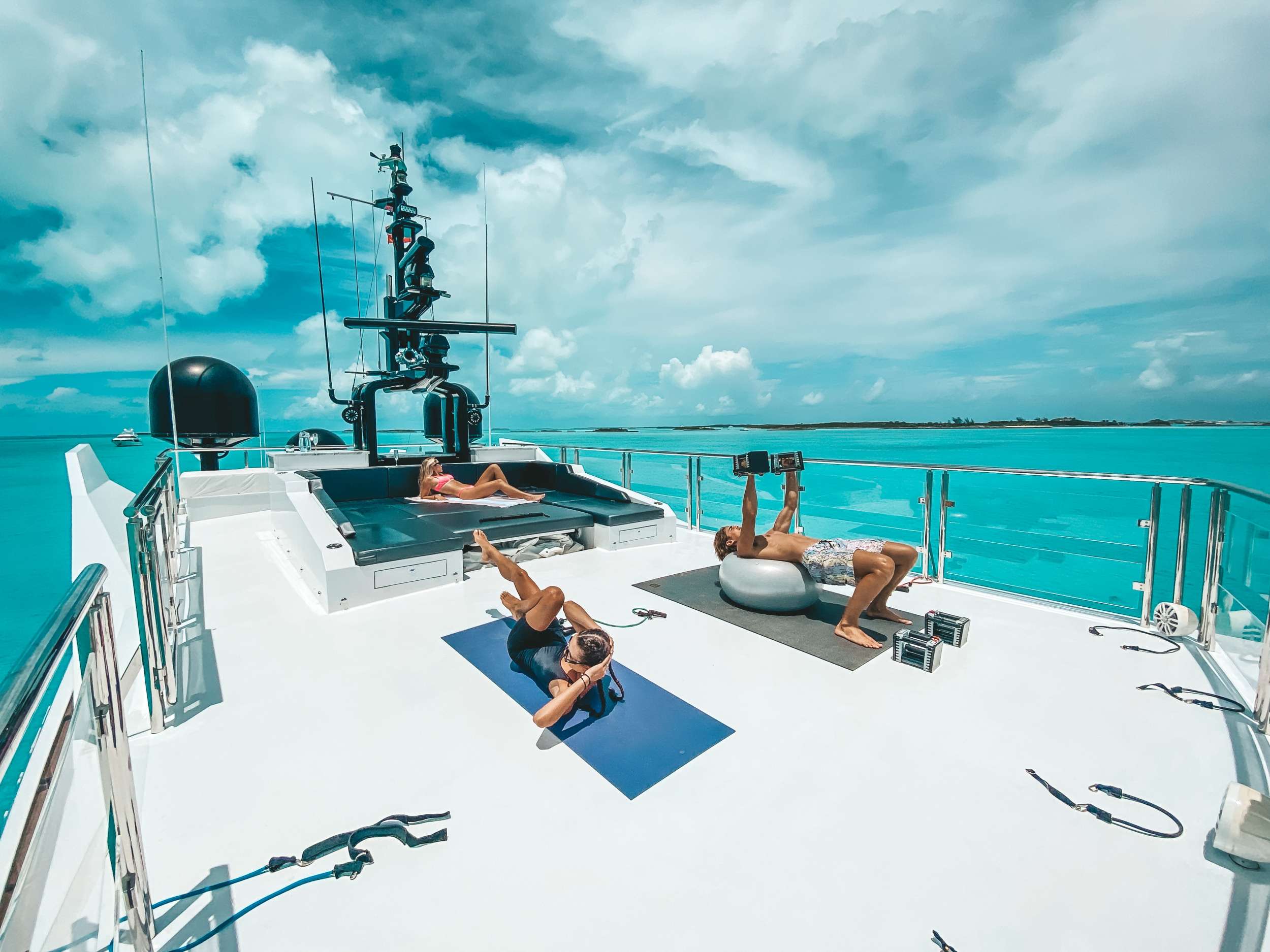 gym equipment on deck and sunbathing area