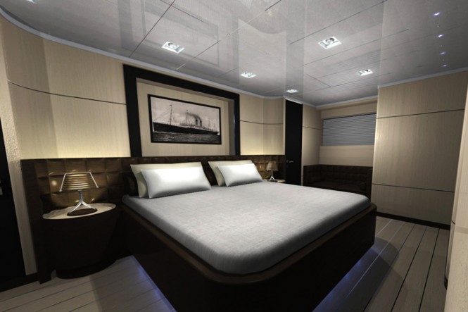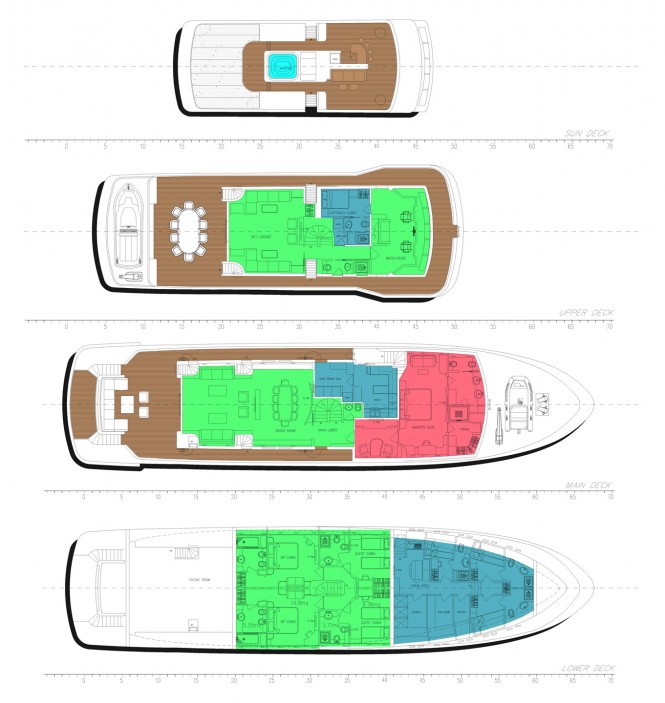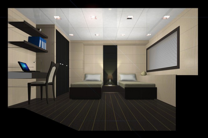 This 35 metre project, UNUSUAL 35 yacht designed by Gian Paolo Nari, has traditional design elements, such as the layout of the main saloon, dining area, galley and master suite, situated on the main deck. The four guest cabins can be found on the lower deck of the motor yacht Unusual 35. Two of which are doubles and two twins. We can also find the crew area forward, together with the laundry, crew mess and three double cabins and engine room.