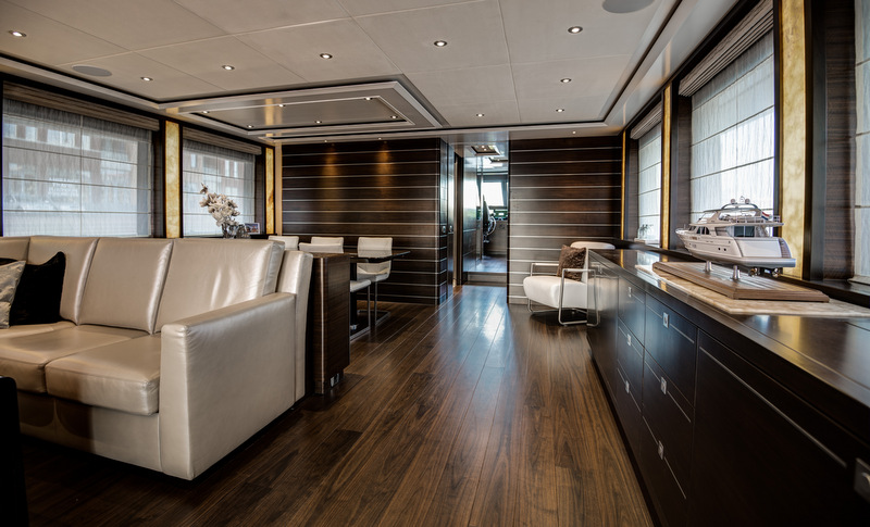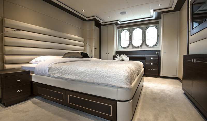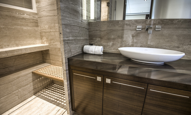 Mulder’s craftsmanship abounds throughout the main joinery, where brushed nickel lines are the main theme, resulting in beautiful and elegantly designed cabinets and walls. Luxurious fabrics of silk, wool and linen like Dedar, Pierre Frei, Elitis and Spinneybeck leather and wool-silk carpets of Tai Ping were used to bring about a sophisticated ambience of comfort and style. The entire custom-built interior consists of stained walnut. The dining area in the spacious saloon with its stunning Onyx Honey window columns accommodates eight people. The professional galley on the port side is fully equipped, including a 12 kW steam oven, and offers a direct connection to the gangway. The main deck also features a day head. The owner’s suite on the lower deck offers a spacious walk-in-closet and large oval portholes on both sides. Additionally, the lower deck features a VIP suite and two guest cabins. All four cabins have their own shower and toilet.