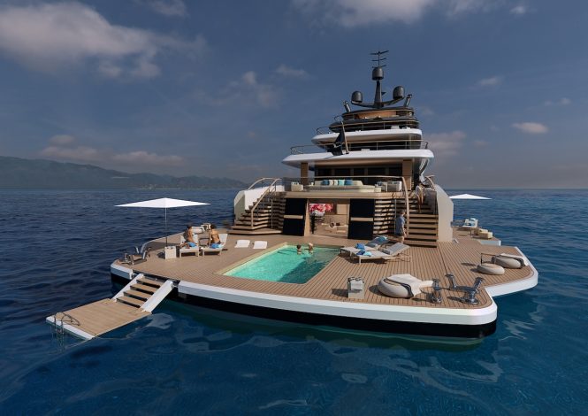 Nauta Design has revealed their latest concept, the luxury yacht NAUTA 78M SLIPSTREAM, featuring innovative fold-down bulwarks which join with the swim platform to create a patent-pending beach club design called 'The Island'.