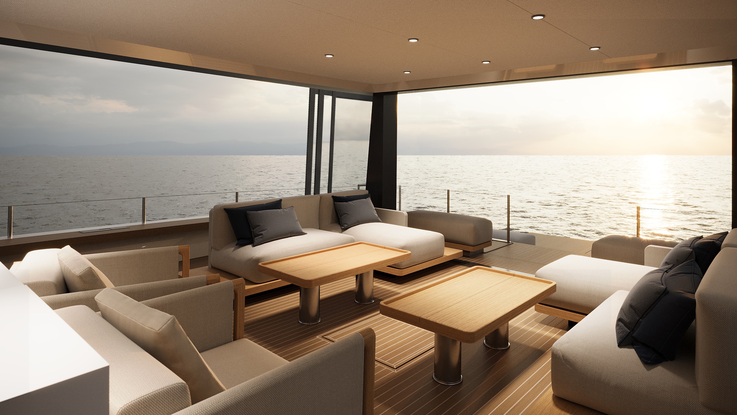 The yacht is characterised by the walk-around deck design and the fabulous elevated 50sqm beach club featuring a fold out terrace on each side and gentle steps up to the cockpit. The semi open cockpit boasts an opening roof and sliding door system to create an al fresco lounge. Alternatively when the doors and roof are closed, the space becomes a cosy and private salon, protected from the elements.