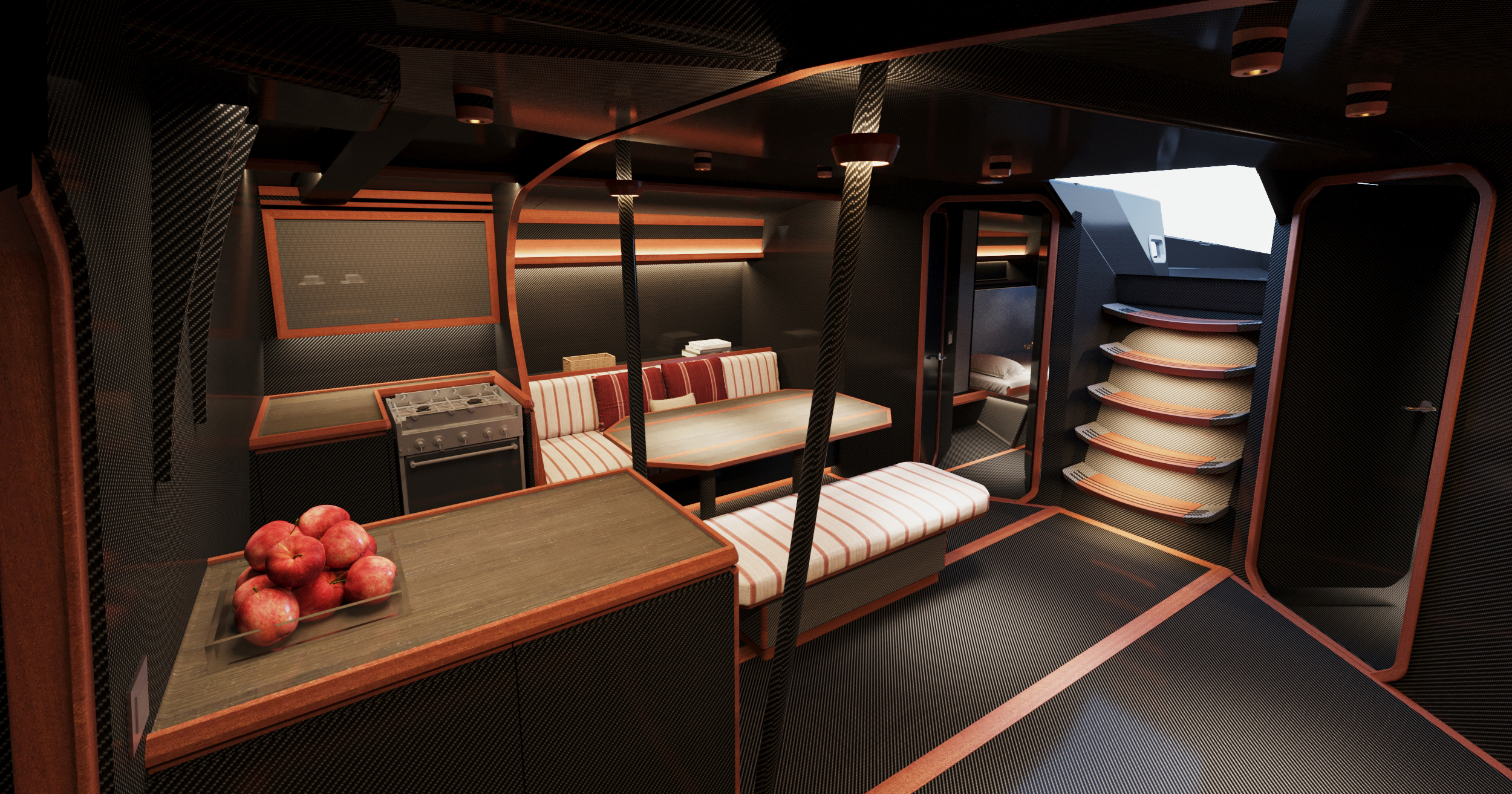 The minimalist interior styling further reduces excess weight while creating an inviting, masculine environment using grey-black carbon fibre accented by rich red-brown mahogany, russet accents in the furnishings and abundant warm lighting.