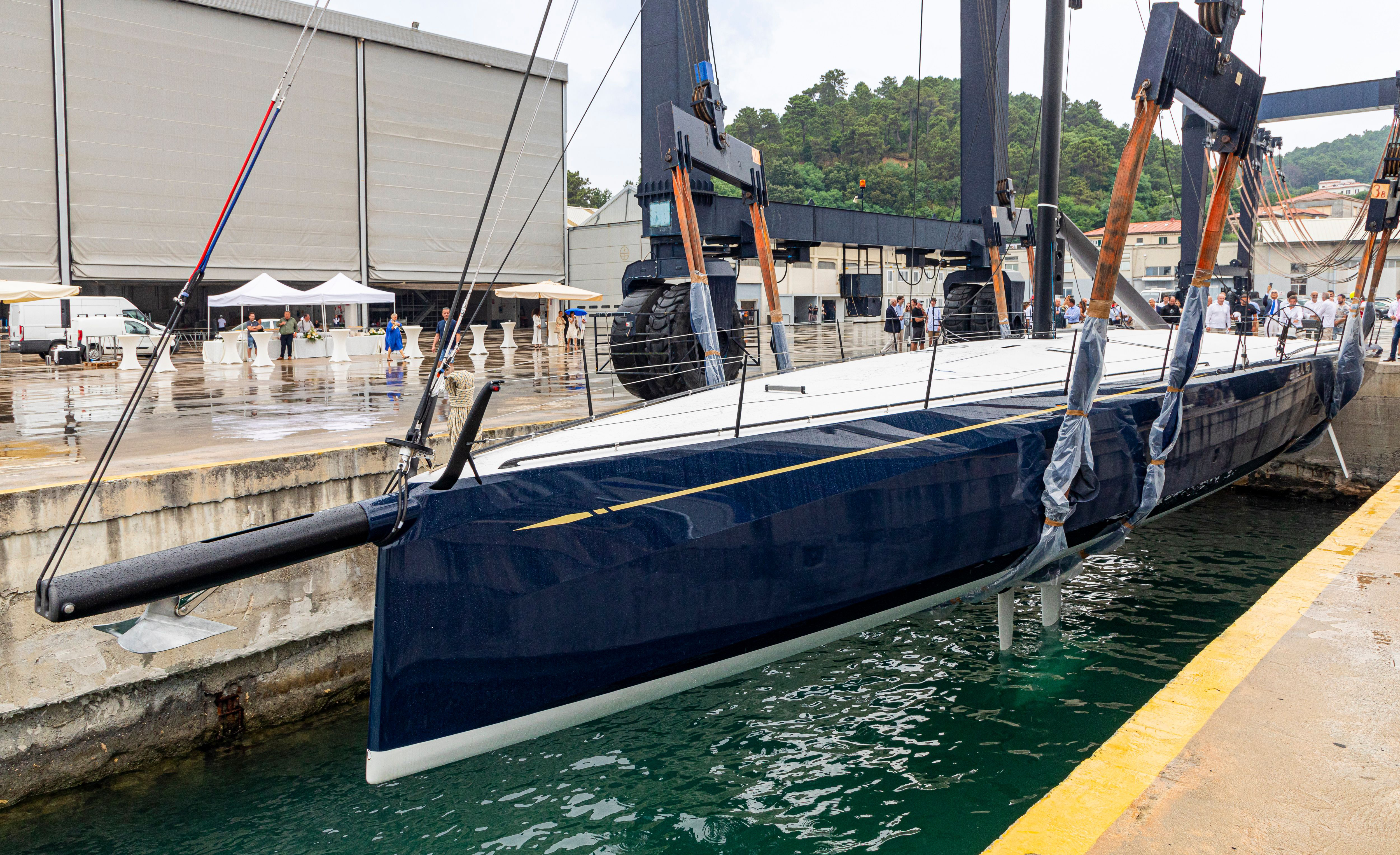 The 24.38m/79.11ft racing yacht was designed for an experienced owner who was in attendance for the ceremony. The exterior styling was created by Juan Kouyoumdjian while the interiors are naval architecture was completed by the shipyard in collaboration with Persico Marine.