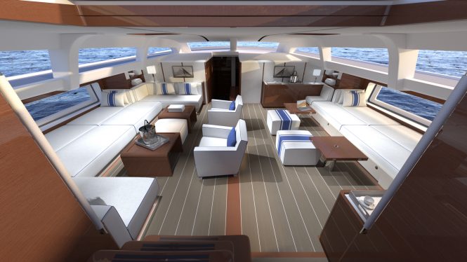 Above deck the uncluttered appearance draws attention to the smooth curve of the coach roof of the main salon, which leads into the sheltered aft cockpit behind. An automated bimini roof folds out from casing to provide shelter from the sunshine and spray, and ‘aisle seats’ are implemented for the perfect viewing position while at leisure or on the move.