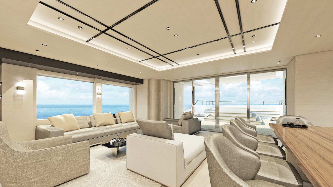 Aft of foyer is the main salon, where the formal dining table designed to seat up to 10 guests leads down the port side of the room with the lounge area adjacent. This is in contrast to the typical main salon layout that places the formal dining area parallel to the forward wall and the main salon close to the aft.