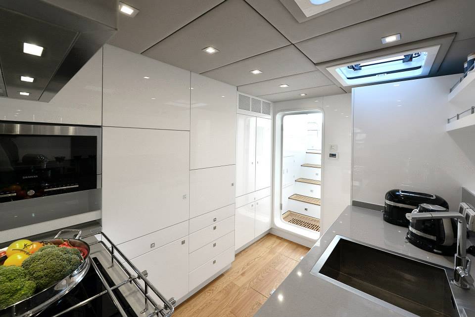 Straight from the saloon is direct access to the master suite positioned at the front of the yacht. Following her predecessor, the 2014-launched sailing catamaran 1 Life, Blue Belly yacht`s master cabin features panoramic views and has a breath-taking magic glass panel separating the his and hers bathroom from the sleeping area. All cabins are touched with oak veneer and corian surfaces, boasting the perfect assortment of fabrics, carefully chosen by interior designer – Orna Weitz from BROSH ALON design office.