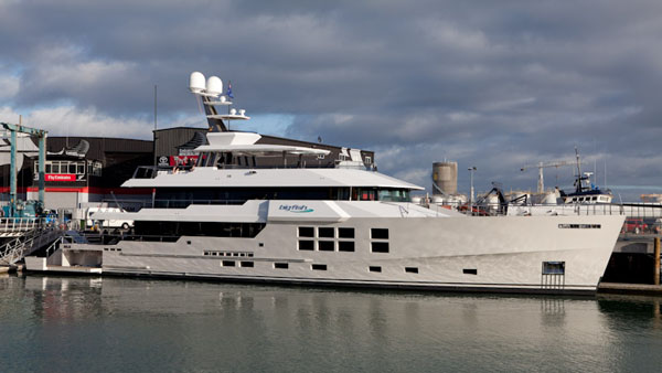 For the first part of her voyage Big Fish was assisted by two harbor tugs, who helped circumvent sandbars on the Tamaki River and negotiate a low bridge clearance. Once clear of Achilles Point Big Fish dropped her tow and headed down the Motukorea Channel under her own power for the first time. Full throttle was achieved at 1625 RPM, with a boat speed over the ground of 14knots. Extensive maneuvering trials were also conducted before an anchor drop test was made. Wing stations as well as bridge helm propulsion controls all operated flawlessly and at a few minutes after Noon, Big Fish was secured port-side-to at the Viaduct with captain, crew, project manager and team of shipyard workers and suppliers highly elated after successfully completing the yacht’s first crucial sea-trial.