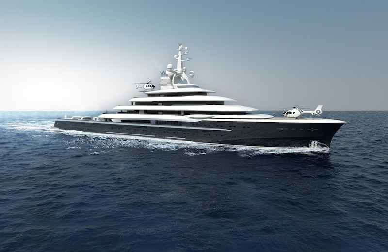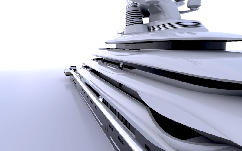 The hull and fender rails will be simple steel, rigidly constructed and matt painted to withstand the wear and tear of mooring and knocks whereas all superstructure surface and decks will be in high-end super yacht style featuring high-gloss paint, polished stainless steel and glass.