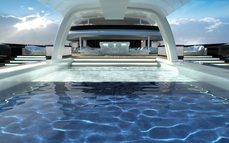 Despite creating a larger and even more generous interior, the space shows best on the vast aft deck, which in-houses a large pool and relaxing landscape, underlined by spacious, fold down terraces for sun bathing and a very large outdoor bar.