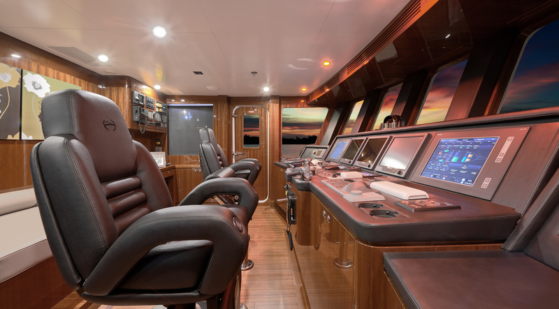 Moving up to the skylounge, this is an area that has been customized for formal dining but has also been thoughtfully designed to function as a salon with a built-in sofa, swivel TV and dayhead. A pantry on the port side has been equipped with all the appliances necessary to make it a secondary staging and serving area, and the inclusion of the dumb waiter allows food and dishes to be moved between the galley and pantry without disturbing guests. The enclosed pilothouse is forward on this deck, complete with a sofa, chart area, leaning post and two helm chairs for navigating.