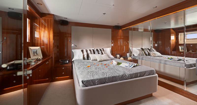 The master stateroom is found on the main deck of superyacht Tango 5 and features a master office, copious storage spaces, King bed, and an en-suite master bath complete with his & hers sinks, water closet, rain shower and Spa Pool tub.