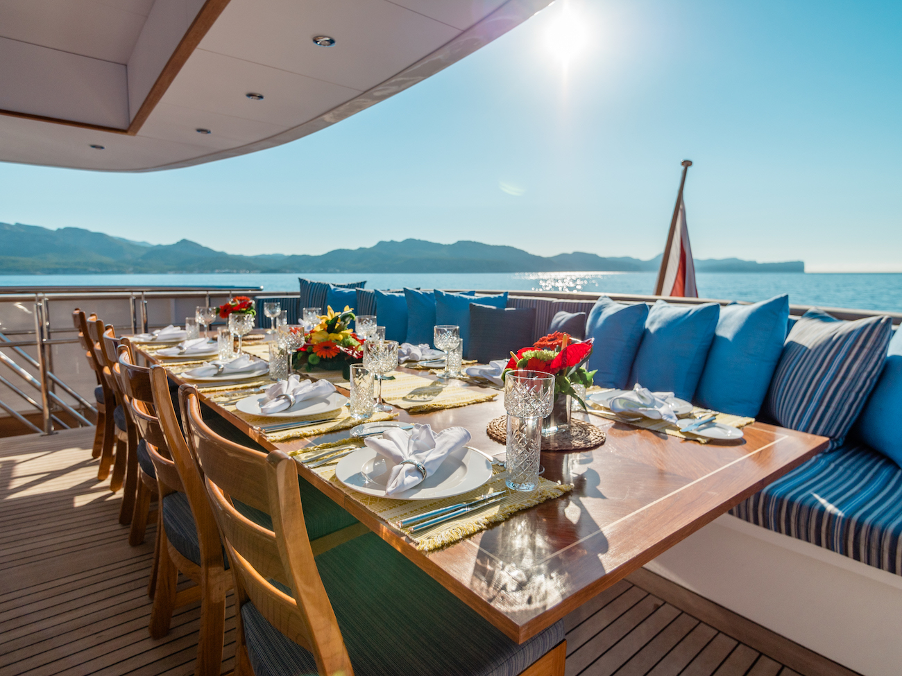 Built with an aluminium hull and featuring naval architecture from Diana Naval Architects, luxury yacht CHESELLA has a beautifully designed exterior with a shallow draft for close beach access. Since her update, the tenders have moved onto the bow, providing plenty of room for alfresco dining, sunbathing and lounging on the upper deck. The sundeck is arguably the best outdoor entertainment space on board, where guests can soak in the forward Jacuzzi and take in the stunning surroundings of the Balearic Islands.
