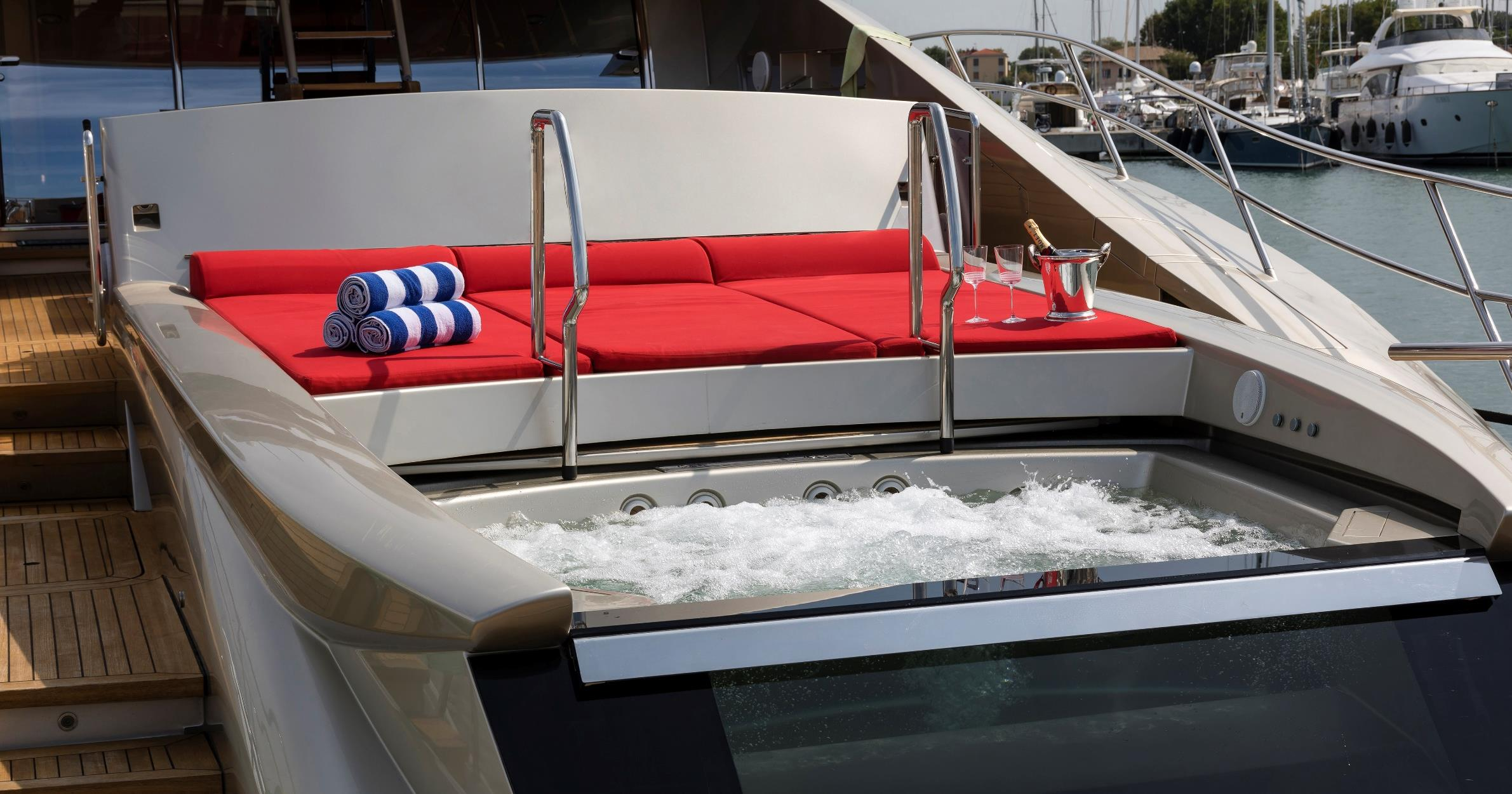 The outdoor areas are a burst of colour thanks to the fuchsia coverings on the sofas and sunbeds: The main deck aft features a spa pool along the stern accompanied by a broad sunbed to dry off in the sunshine, then an alfresco dining area for lunch in the shade. A second large sunbed can be found on the foredeck for when guests want to spread out and enjoy the peace and quiet, and a third sunbed on the flybridge enjoys uninterrupted views of the brilliant blue sea and pale shores. The sun-exposed aft flybridge lounge is a great place to unwind with drinks and watch the sunset or a film in this alfresco cinema.