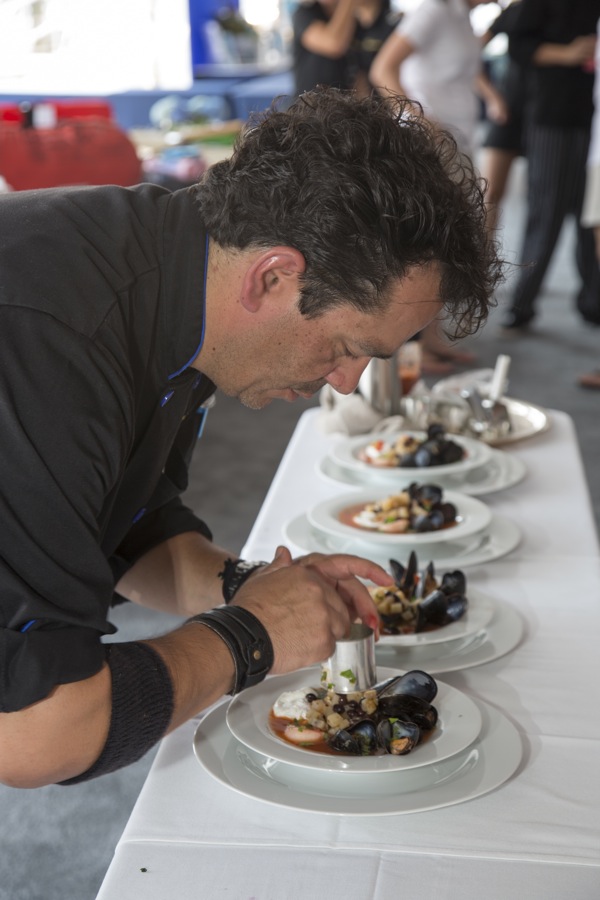 Chef Jean Paul of the 150-foot motor vessel Encore took third place in the Grande Class of the Newport Charter Yacht Show Culinary Competition with his dish that consisted of poached scallops and eggs with steamed mussels (photo credit Billy Black)