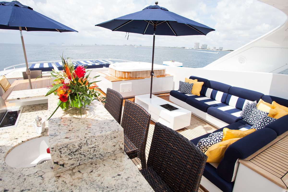 Enjoying the balmy Bahamian weather aboard M/Y CHARISMA is easily achieved with vast exterior decks. On the main deck aft, a teak alfresco table invites relaxed shaded dining experience. Just beyond, steps lead to the extended swim platform, where the crew offer up some fantastic water toys. Ideally suited to socializing, the upper deck certainly delivers, complete with alfresco dining, seating, cocktail tables, wet bar, sun pads and the all-important jacuzzi to unwind in.
