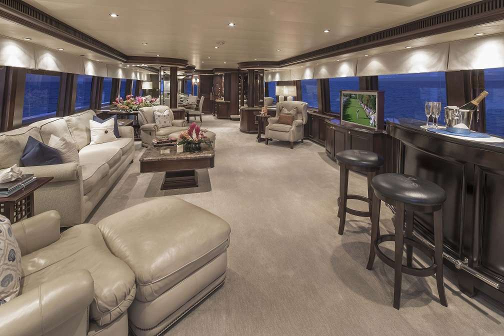 The interior décor is contemporary with neutral tones, plush furnishings and ample natural light, creating a welcome ambience, perfect for socializing. The main salon is open plan, featuring a wet bar aft, lounge central and formal dining forward. An upper sky lounge boasts a spacious lounge area, with an opposing wet bar to starboard.