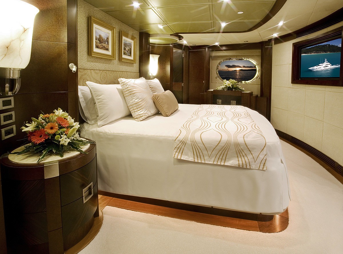 On her lower deck, there is a full-beam master stateroom, double and a twin cabin, all well-appointed and with private en-suites.