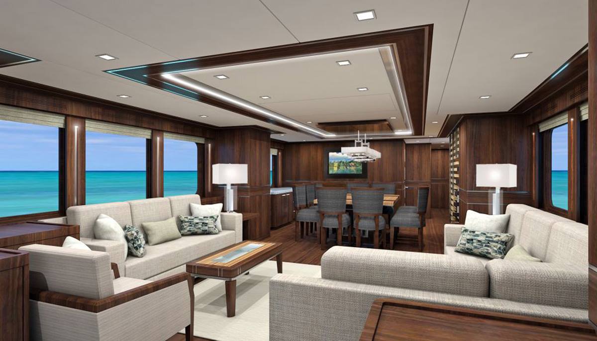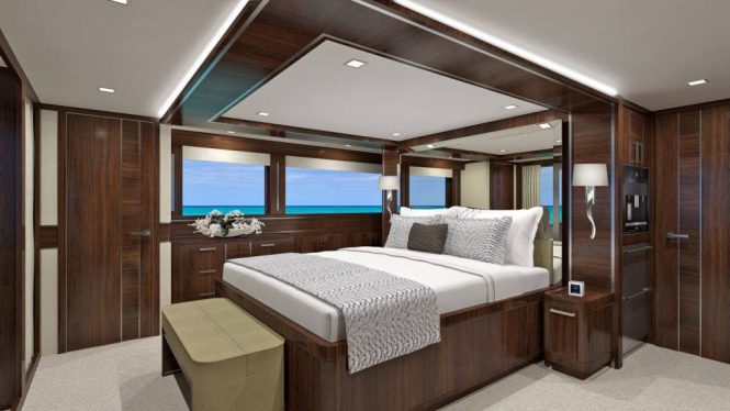 Her hull paintwork is blue with a red waterline and a white superstructure. Her interior design was completed by Destry Darr Designs using timeless styling updated to contemporary tastes using rare stones, walnut panelling and furnishings with accents in stainless steel.