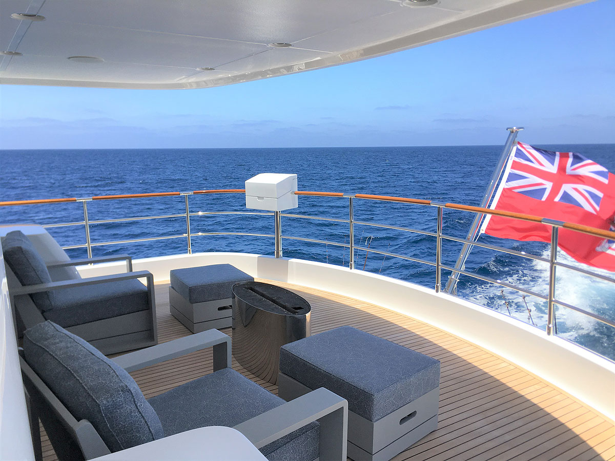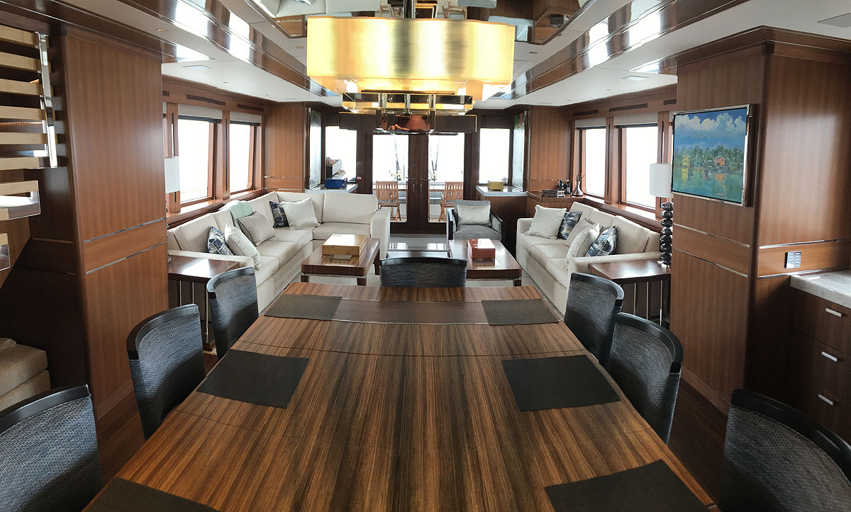 The interiors by Destry Darr Designs area modern, elegant and offer great comfort to guests on board, with large living areas boasting walnut wood, stainless steel inlays, Lutron lighting and fabulous stonework. The woodwork is combined with a neutral colour scheme of grey, cream and brown.