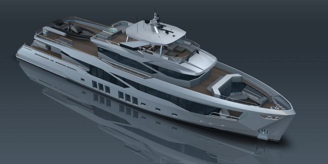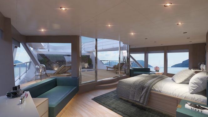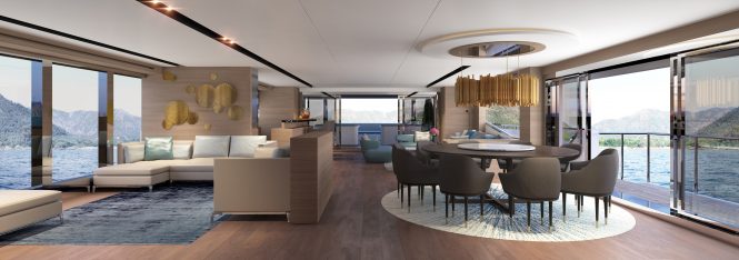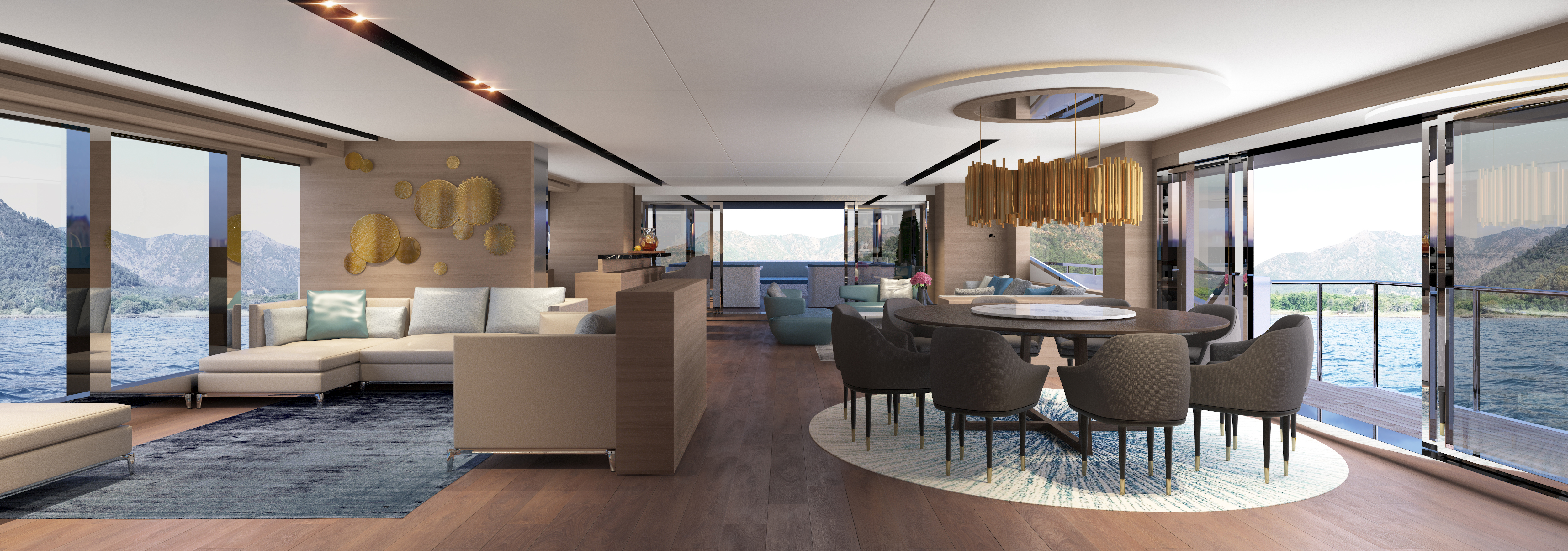 Concept images reveal a broad beam that places the formal dining area and lounge side by side on a main deck surrounded by floor-to-ceiling windows and glass sliding doors that open out to the exterior to the sides as well as to the aft. A second larger salon is also placed within this large open-plan main deck space, with a C-shaped sofa and chaise-loungers placed around a coffee table, plus a nearby bar to serve refreshments throughout the gathering.