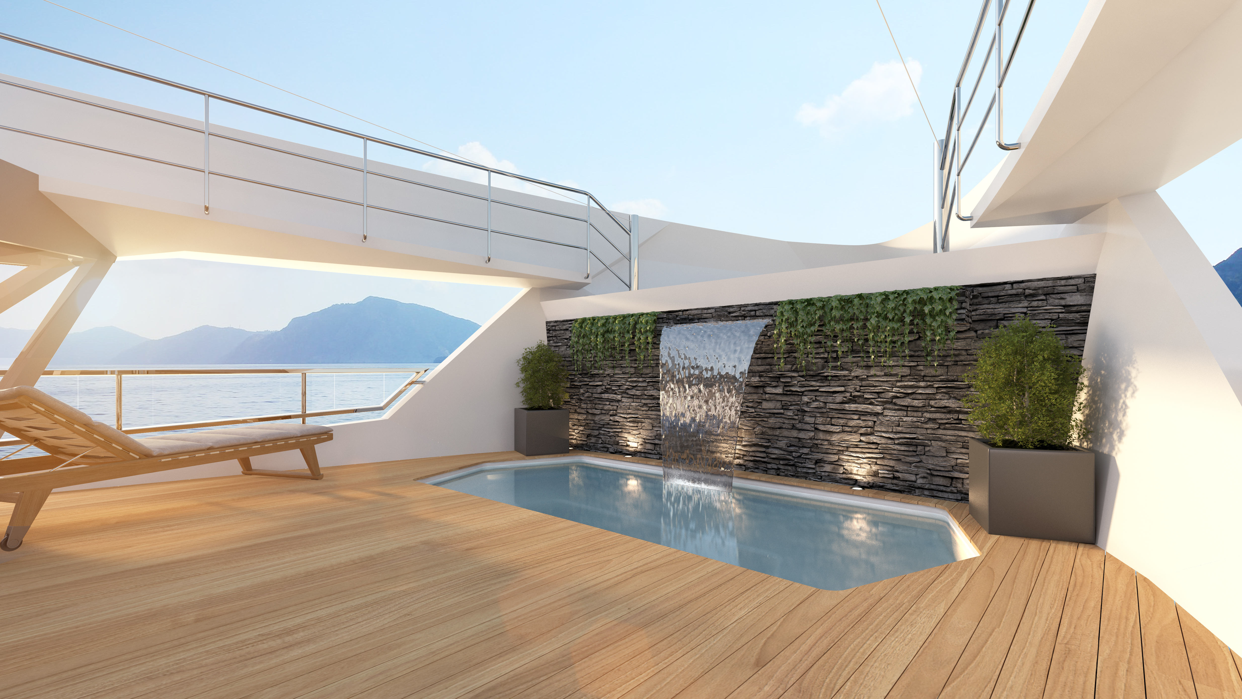 The accommodation places a Master suite on the main deck, with the his-and-hers en-suite bathrooms joined in the middle by a walk-in-wardrobe behind, and a forward door leads out to a private bow sunbathing area with a spa pool and infinity waterfall. The main deck also has an office and gym in addition to the aforementioned lounges.
