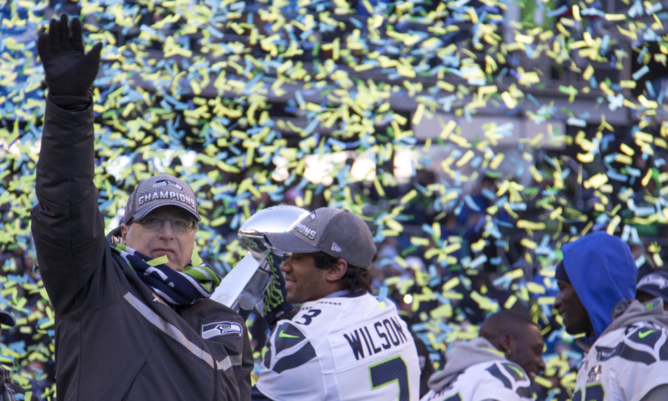 Paul Allen waves to the 12s during the Super Bowl parade and rally at Seattle’s CenturyLink Field in February 2014. Credit Courtesy of Vulcan Inc.