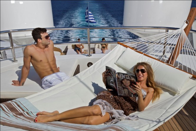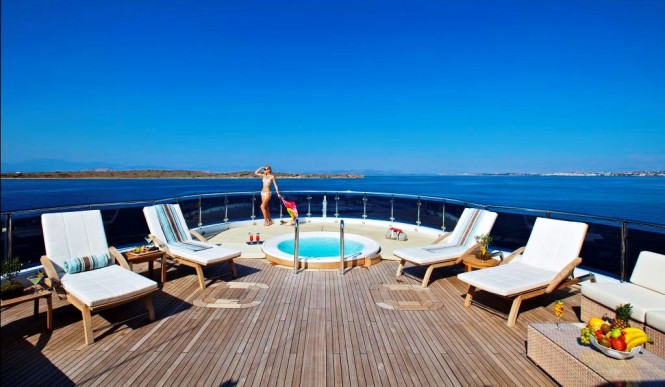 She also offers relaxation in her massage parlour, exercise in the gymnasium/yoga studio, rejuvenatation with your private beauticians. Or alternatively, you can let loose in the indoor and outdoor Spa Pool or utilise one of the many water spoert toys on her aft swimming platform.