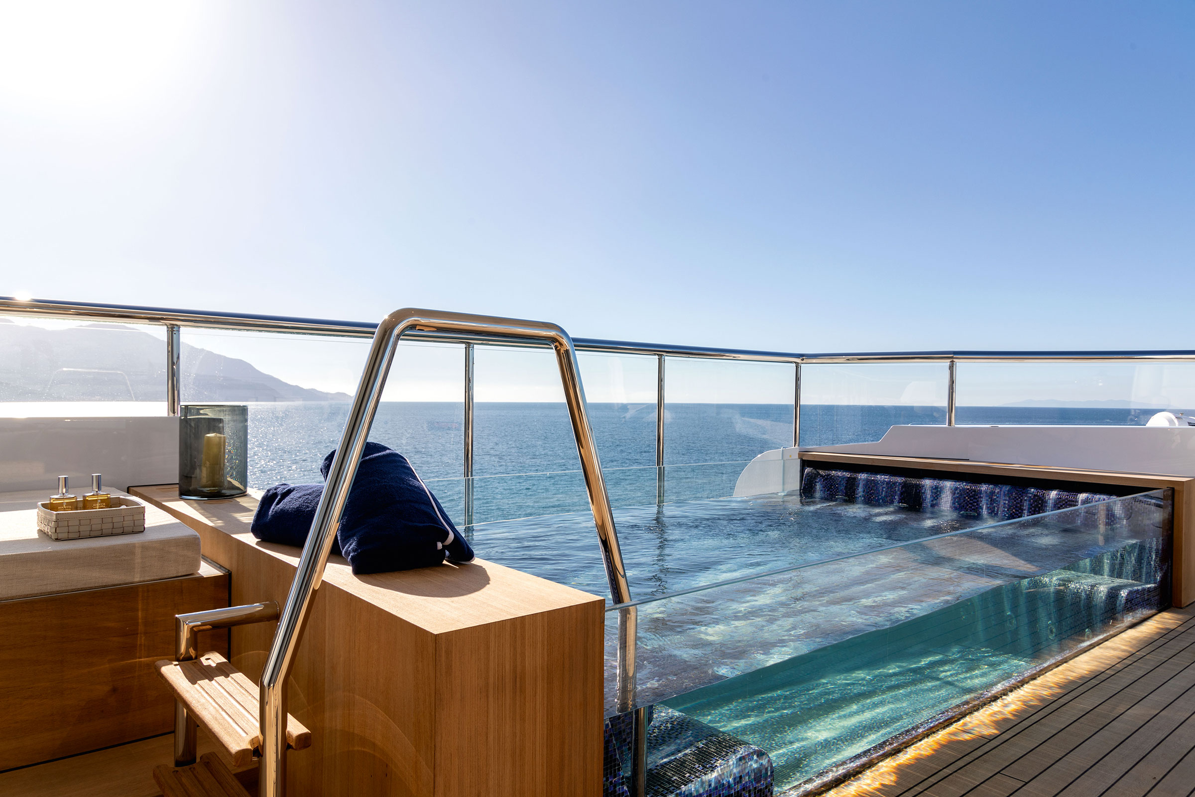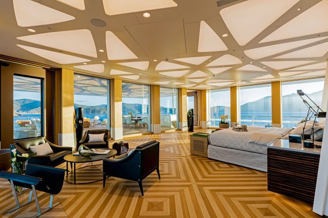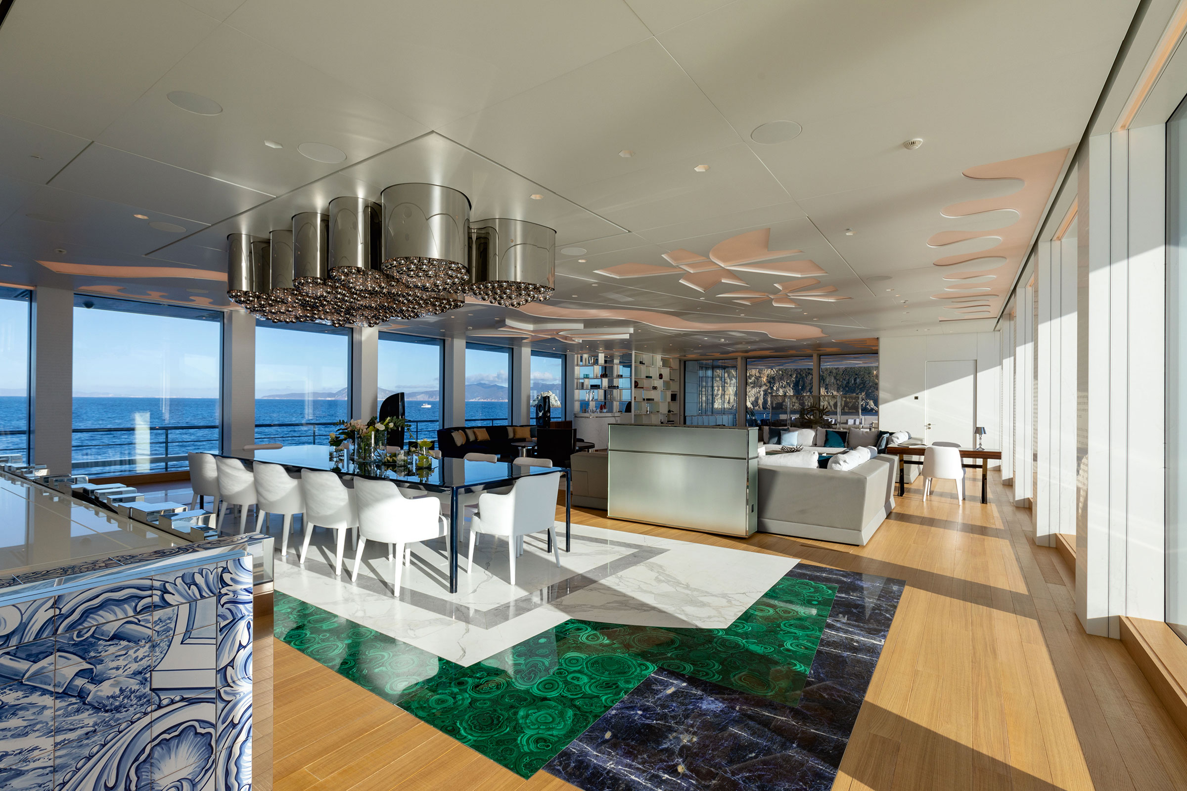 As alluring as the exteriors are, it’s the interiors that steal the show: Designed by Zaniz Interiors, there are homages throughout to celebrated artists and creatives, such as the Damien Hirst-inspired circles on the French limestone floor in the main deck foyer, and the ‘stairwell eye’ nods to Man Ray. The geometric style of Matisse’s later collage work is used in the sky lounge and salon, creating a focal point in the marvellous hand-forged steel lighting fixture that has been polished to a mirror finish and encloses a thousand Bohemian crystal bulbs within. The beginning of Moby Dick is engraved into the pillars, and Portuguese Majolica tiles can be seen on the cabinetry from Boca do Lobo.