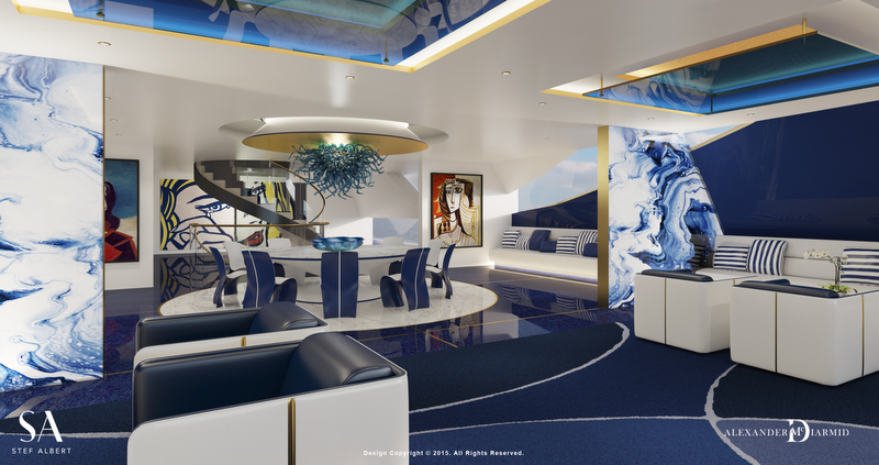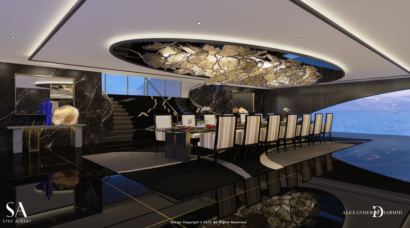Based in Aix-en-Provence, South of France, British designer Alex McDiarmid has teamed up with New York-based interior designer Stef-Albert to create interior design for the striking 87-metre mega yacht IWANA, focusing on the Owner’s Deck and Main Deck, with guest dining, bar & entertainment areas. A love for great design as well as their mutual admiration of opposite yet very complimentary skills brought the two passionate designers together in creating the magnificent interior design for luxury superyacht IWANA.