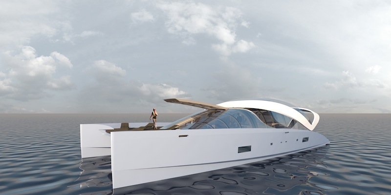 Frédéric Sarfati on design and Raphaël Krepser on production both wanted to create a catamaran that would blend in with its surroundings while also offering a surprisingly spacious living area: 280 square metres of living space; the quest for maximum fluidity of movement, helped by the possibility of going directly from stern to bow in a straight line via the saloon (65 m² surface area), going through a 10m² doorway at the front of the deckhouse. This door opens upwards using an electrically-operated hydraulic system. The view here is all-encompassing with an uninterrupted line of sight.