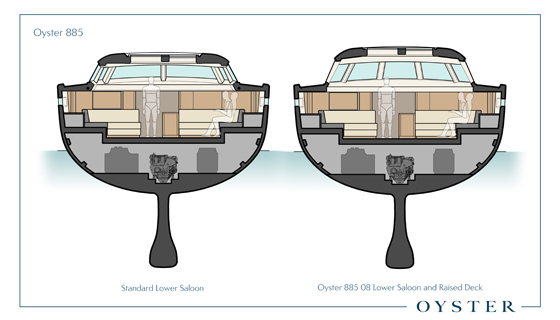 The Oyster 885 is available with two different superstructures dramatically changing the headroom in the saloon. The first Raised Saloon version – superyacht Oyster 885-04RS – was delivered to her owner earlier this year and hull number 07, also a Raised Saloon version, is expected to be delivered in Spring 2016. All the rest have been variations on the Deck Saloon version.