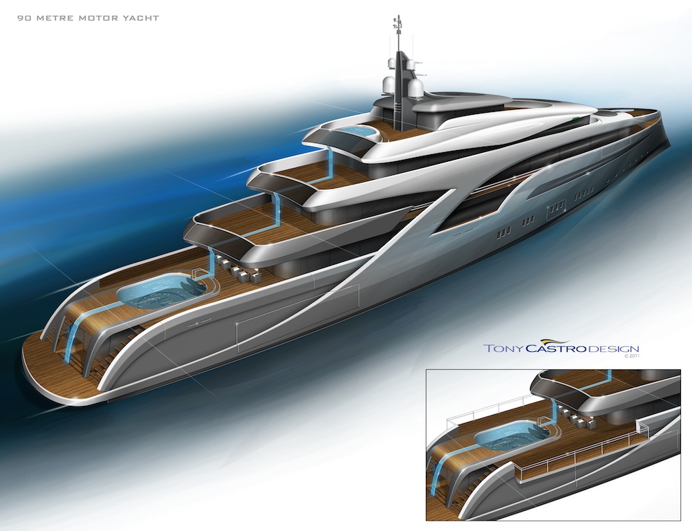 Another one of Tony Castro‘s stunning designs we have published in May is the TC 90M superyacht concept with accommodation for up to 22 guests in 11 state-of-the-art cabins. The TC 90M features an exciting aft deck arrangement which includes a large pool and folding down bulwarks. Perhaps the most interesting feature on the Tony Castro TC90M must be the cascade of water running from the Spa Pool on the sky-deck all the way down to the aft platform via a series of illuminated channels within the teak decking.