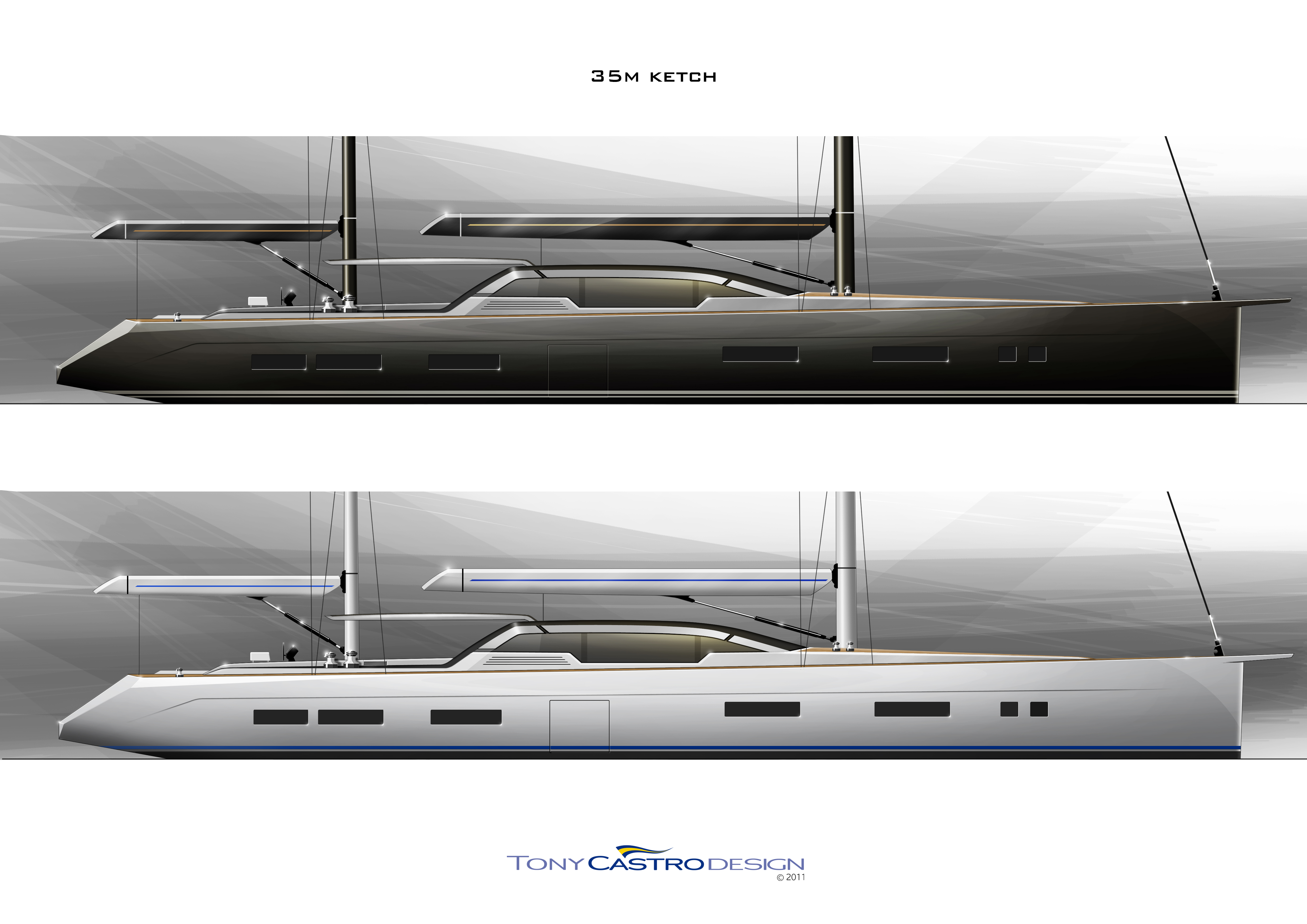 Tony Castro’s recent projects also include a 35M sailing yacht with a contemporary exterior, practical layout and staggering design. The 35M Tony Castro ketch is designed to offer accommodation in one master suite, one VIP and two twin cabins to a total number of 8 guests. This yacht concept has also been created in a 57 M version – see image below.