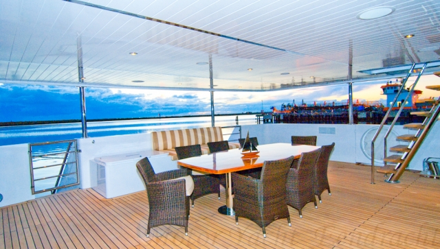 A spacious lounge and dining area, shaded alfresco deck, forward sun pad and aft shaded spa area offer space and privacy for relaxing between diving, snorkelling and shore visits.