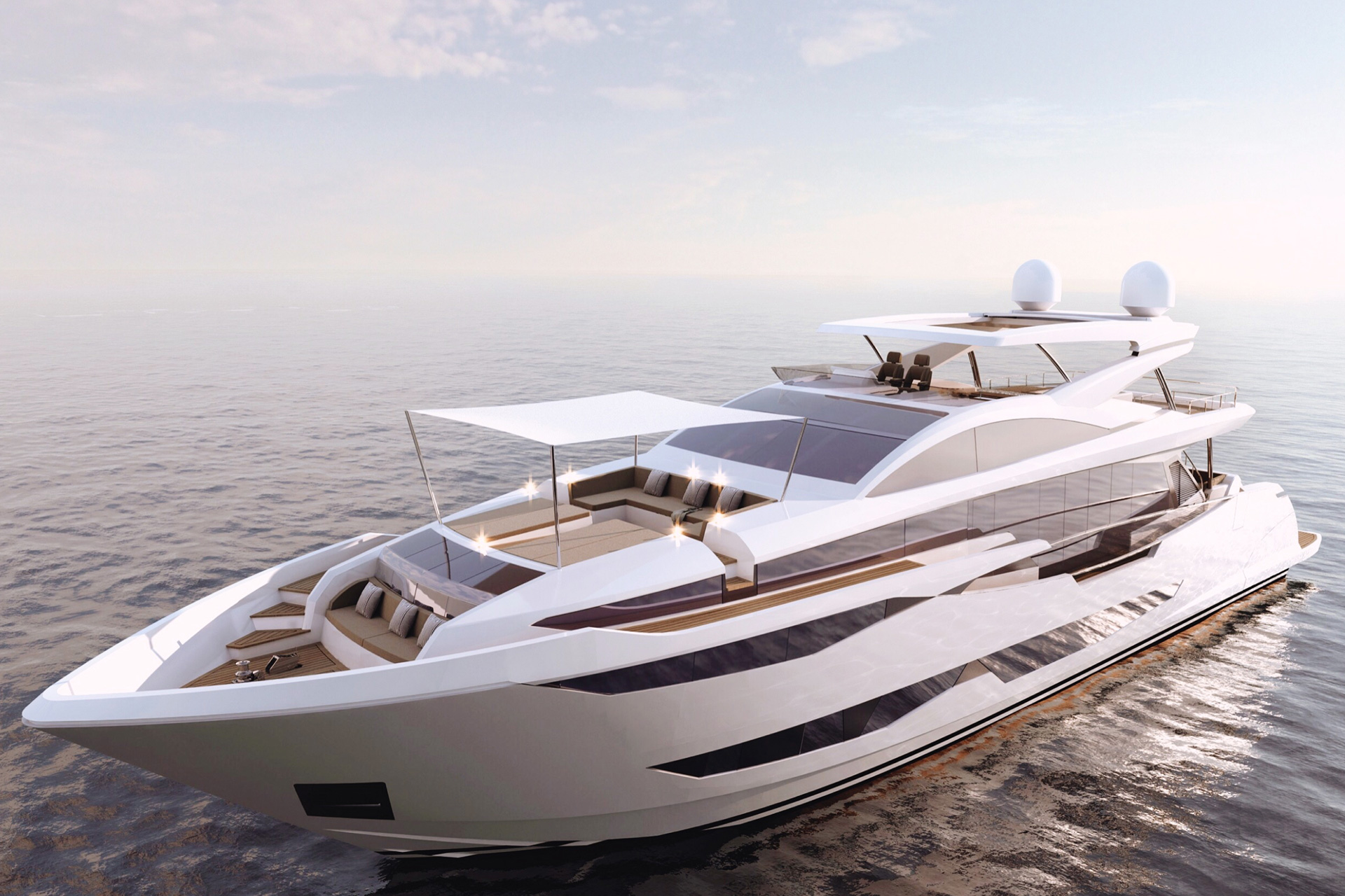 The jet ski and tender garage transform into a beach club with a bar. There is also a hydraulic swim platform for some extra sunbathing space. Another great outdoor area onboard is the airy cockpit with alfresco dining setup. The bow hosts seating and sun pads with a removable shade. A large Jacuzzi, wet bar, bbq and seating are on the flybridge.