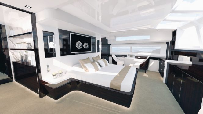 PEARL 95 features fantastic manoeuvrability and cruising capabilities, while her interior living spaces have lots of natural light, thanks to the extensive glazing. The main salon is perfect for a get together to relax and socialise: there are a large sofa and forward dining area for eight guests. The master suite is located on the main deck and is a full-beam size. The lower deck layout consists of two double cabins and two twin cabins, making it possible to sleep a total of 10 guests.