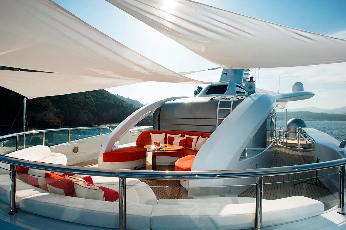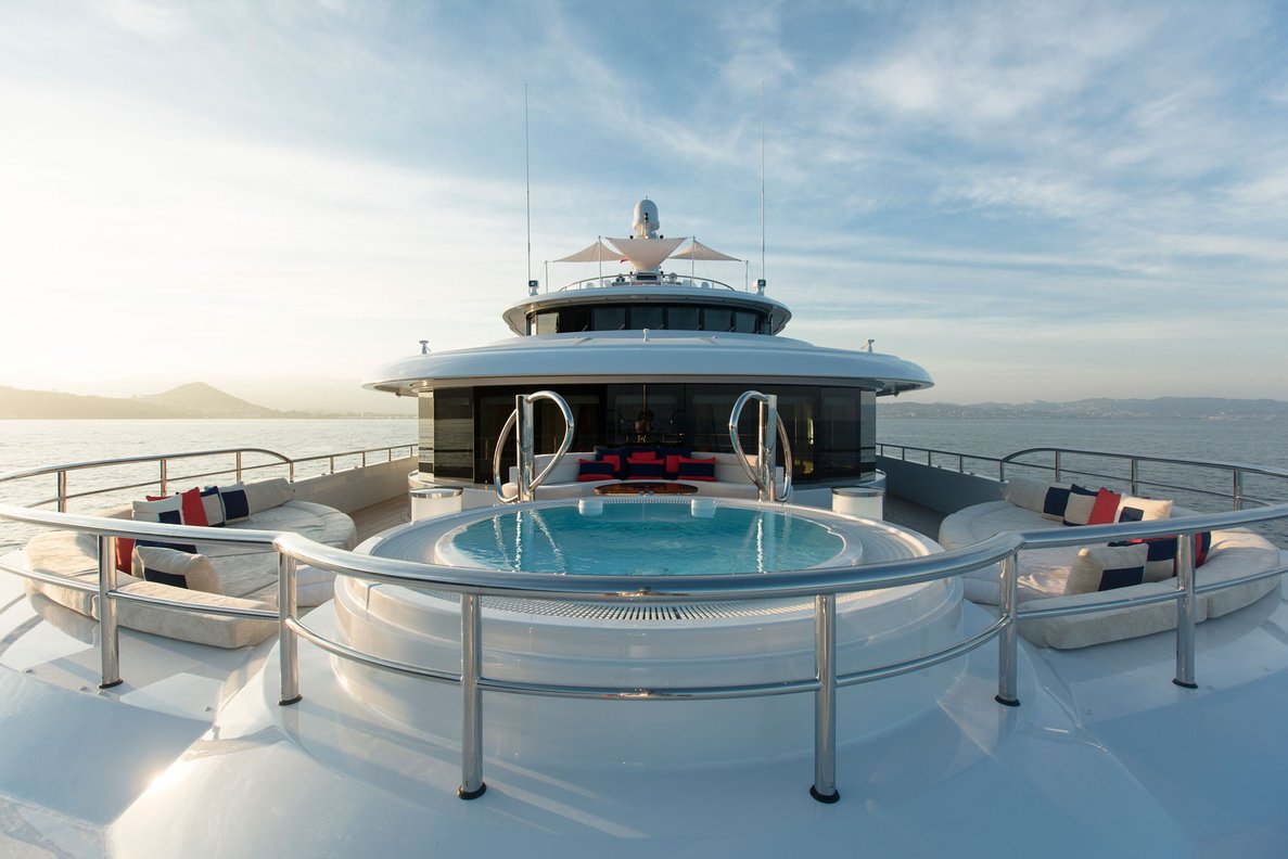 On deck, M/Y ARIENCE features a shaded aft area with comfortable seating and direct access to the salon and lower deck swim platform. The upper deck aft boasts alfresco dining, sunning and seating. The sundeck is sure to be the hotspot for the outdoor charter guests in the group, complete with a deluxe glass-sided pool, bar top with seating, sunning and optional shade when required.