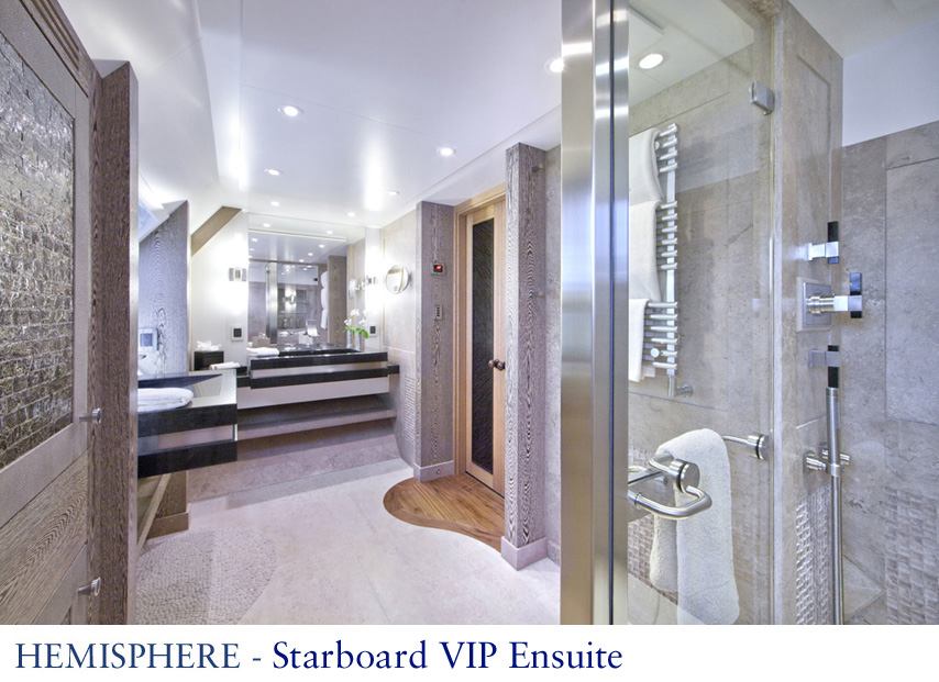 Having chartered yachts for many years the Owners of Hemisphere started the project with a very clear brief: to create a family friendly interior style, using practical and easily maintained yet luxurious surfaces and textures. During the project the Owner’s wife was involved with all details; “She knew what she liked instantly” says Mick Leach. Attention to detail is second to none, with a consistent organic theme reflected in the great variety of finishes: a total of 18 leathers have been used and 15 types of stone, doors are lined with wrinkled dark leather, waves of pebbles line the showers, distressed walnut storage units provide a smooth contrast to crocodile finishes.