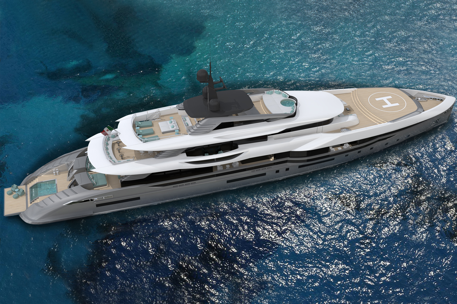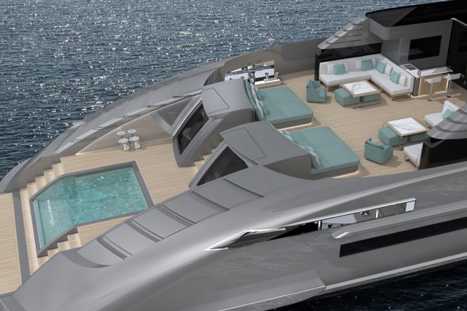 The exterior spaces include a spacious outdoor lounge, alfresco dining and bar area with Jacuzzi. Foredeck hosts a separate sunbathing area, as well as a touch-and-go helipad. The flybridge is equipped with a dedicated sunbathing area. The openable central platform at the stern forms a beach club with a large pool and seating.