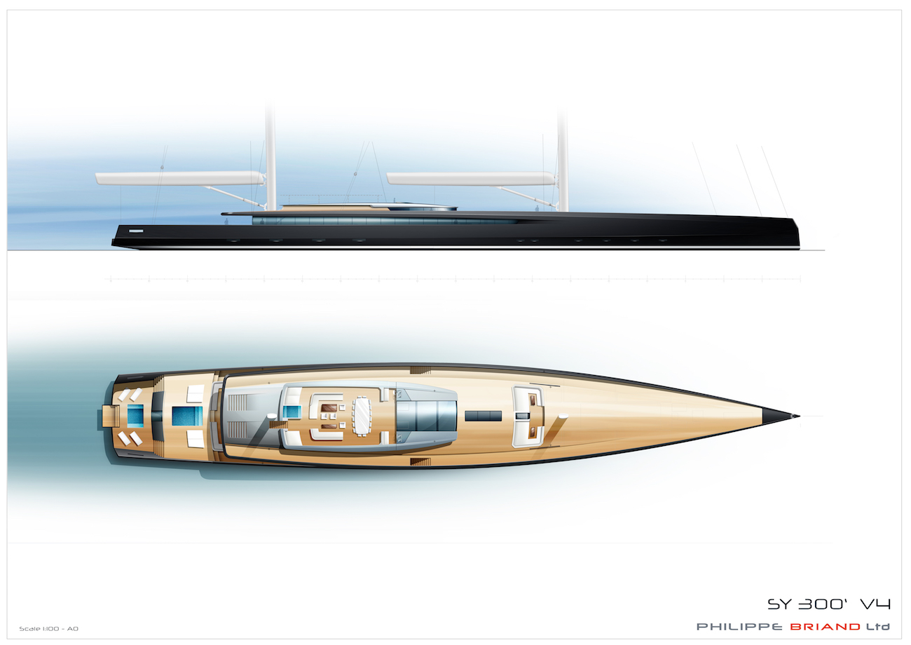 Philippe Briand has had extensive experience over his career in designing carbon fibre masts and rigging, most notably with 67m/219.8ft sailing yacht VERTIGO and 73m/239.5ft SYBARIS. SY300 will have a two-masted design with a foremast reaching 95.3m/312.6ft above the waterline, a 3,560m²/38319ft² upwind sail area, a 6600m²/71041ft² downwind sail area and a spinnaker of 3,500m²/37673ft².