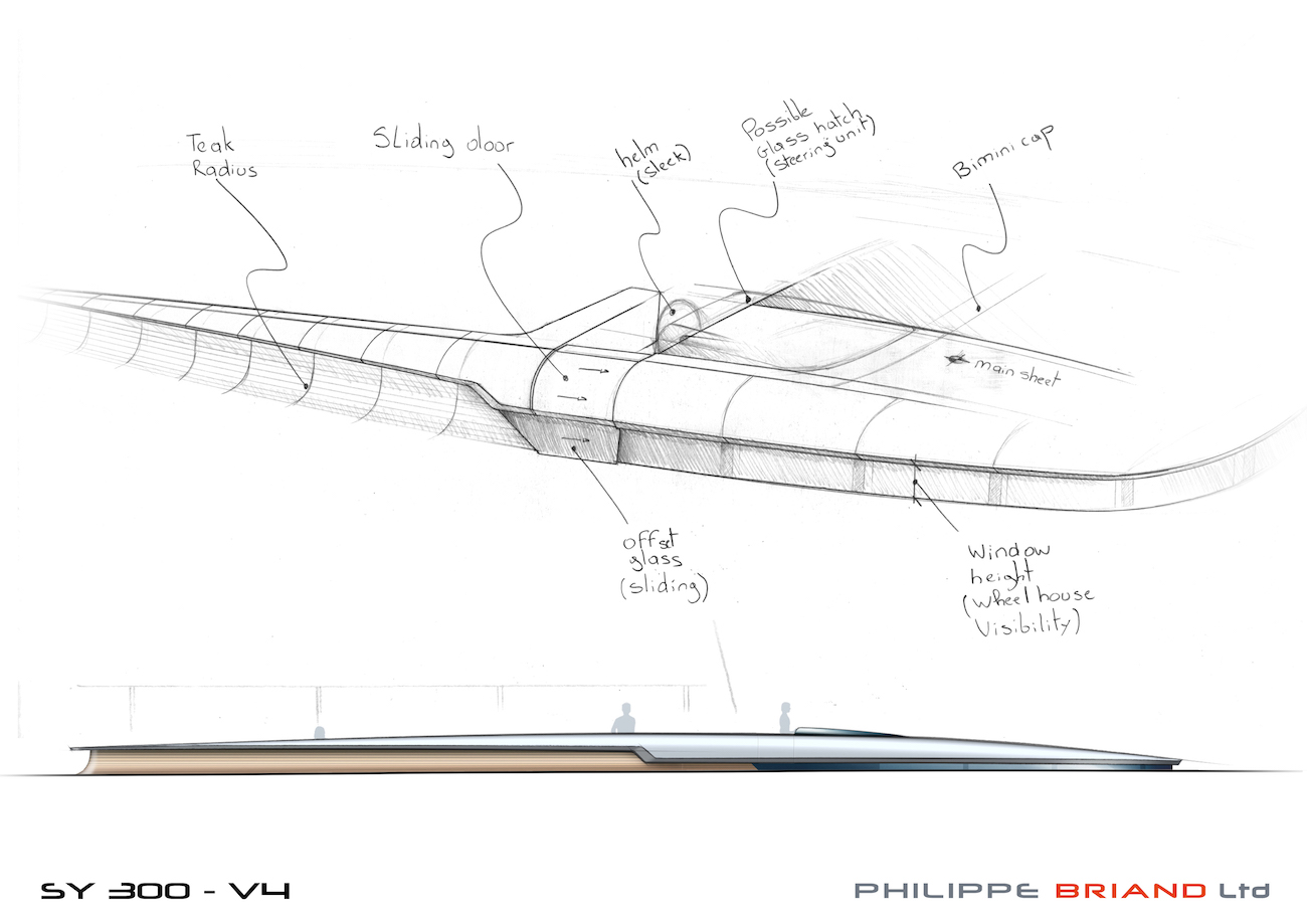 “I am a purist at heart. Every Philippe Briand design is guided by the golden principles of balance, efficiency and performance on the water… the SY300 design showcases a yacht with a purpose that is in keeping with the authentic spirit of sailing. I picture it, being ideal for a passionate sailor who wants to stay in touch with the water and the power of the wind. They could even take the helm of the yacht themselves.”